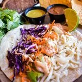Woodfired shrimp with cheese, avocado, cabbage, carrots, elote dressing and cilantro aioli dressing