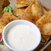 Crispy flour tortillas filled with pork pastor and cheeses, lightly fried; served with avocado salsa ranch and white queso