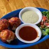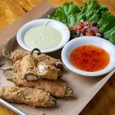 Fresh jalapenos stuffed with a spicy cream cheese mix and pulled pork, then wrapped in bacon mesquite smoked and lightly fried. Served with avocado salsa ranch
