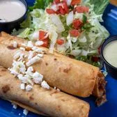 Crispy Corn tortillas stuffed with seasoned chicken lightly fried and served with ranchero sauce