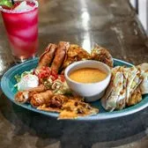 Chicken quesadillas, crispy taquitos and fajita steak nachos, served with pico de gallo and chili con queso