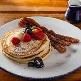 vanilla pancakes topped with butter and served with maple syrup and crispy bacon