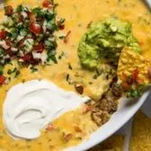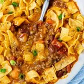 Fritos topped with Chile Con Carne, Chili Con Queso, Pico de Gallo, Cheddar Cheese, Jalapenos & Sour Cream