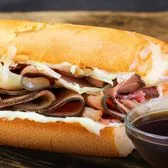 Black angus steak, Swiss, sautéed onions, creamy horseradish, side of au jus.