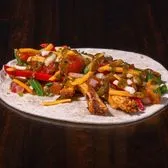 Marinated and grilled chicken, grilled onions and peppers, pico de gallo, mixed cheese, tomatillo salsa on a flour tortilla. Contains: milk, soy, wheat.