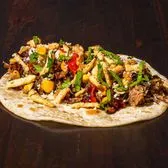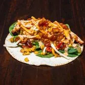 Smoked beef brisket, barbecue sauce, crispy onions, grilled corn relish, cilantro, chipotle sauce on a flour tortilla. Contains: milk, soy, wheat.