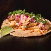 Fried shrimp, cooked cabbage slaw, pickled onions and jalapeños, cotija cheese, cilantro, lime wedge, chipotle sauce on a corn tortilla. Contains: eggs, milk, shellfish, soy, wheat.