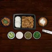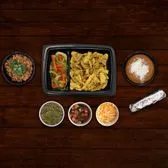 Family pack serves 4–5. Marinated and grilled chicken breast, grilled onions and peppers, pico de gallo, mixed cheese, tomatillo salsa. Includes chips, beans, rice, and choice of tortillas (flour, corn, combo). Contains: milk, soy, wheat.