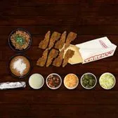 Family pack serves 4–5. Fried chicken, green chiles, lettuce, pico de gallo, mixed cheese, poblano sauce. Includes chips, beans, rice, and choice of tortillas (flour, corn, combo). Contains: eggs, milk, soy, wheat.