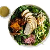 Romaine, blackened chicken thigh, organic black bean, roasted corn, pickled onion, cotija, organic blue corn tortilla strips, avocado, lime wedge, creamy jalapeño lime dressing (1oz: 40 cals) Gluten Free