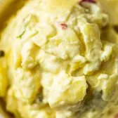 Homestyle diced potatoes mixed with a mustard and mayo-based dressing.