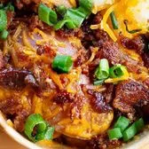 Buttered new potatoes topped with cheddar cheese & bacon crumbles, sprinkled with slivered green onions.