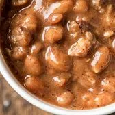 Tender green beans simmered in a savory sauce with BACON! And, yes, they still count as a vegetable.