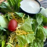 Side portion green salad with carrots, tomatoes, purple cabbage, cheese, and your choice of dressing.