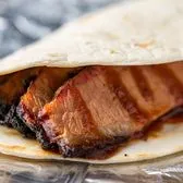 Slices of meat on a flour tortilla served with sauce, pickles and onions. Add cheese!