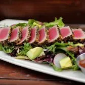 line caught, seared-rare furikake-crusted yellowfin tuna, field greens, carrots, radish, avocado, pickled cucumbers, peanut ponzu vinaigrette + soy dipping sauce on the side