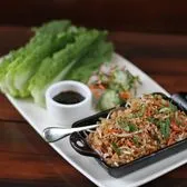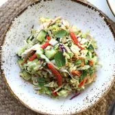 hand-shredded chicken breast, chopped napa cabbage, mint, cilantro, carrots, red bell peppers, cucumbers, spicy peanut vinaigrette