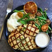 marinated + grilled boneless chicken breasts, cauliflower mash, sautéed green beans, heirloom tomatoes, sliced almonds, citrus cream sauce on the side