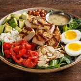 With crunchy, oven-roasted garbanzo beans, jammy egg, avocado, almonds, tomatoes + feta cheese on a bed of supergreens with honey apple cider vinegar dressing on the side