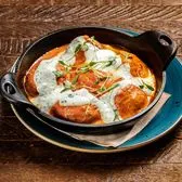 Chicken meatballs topped with a spiced tomato curry sauce, cooling cucumber drizzle + micro cilantro