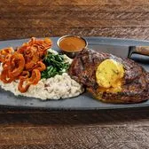 All-natural durham ranch grass-raised wyoming bison + wagyu beef, smoked bacon, BBQ sauce, red skin potato mash, sautéed spinach, haystack onions and a burgundy wine sauce