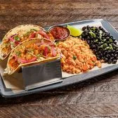 Corn + flour blend tortillas, lemon tartar sauce, pickled red onion, salsa, spanish rice + cilantro black beans on the side