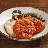 Hand-dipped buttermilk boneless chicken breast, red skin potato mash, white gravy, hot honey, sautéed spinach with smoked bacon