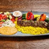 Tender pieces of steak and veggies, with yellow rice, tomato-cucumber-feta salad, kalamata olives, tzatziki sauce, roasted red pepper hummus
