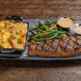 12oz USDA Choice new york steak topped with herbs and served with green beans + roasted vegetables, potato au gratin, housemade green peppercorn