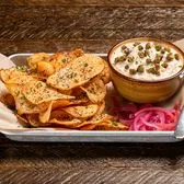 Smoked riverence farms rainbow trout, housemade garlic-herb sour cream dip, crispy capers, everything bagel potato chips, pickled red onions