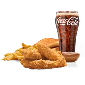 3 tenders served with Texas toast, a side of your choice, 1 dipping sauce and a drink.