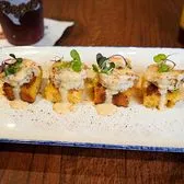 four herb roasted shrimp served on bites of crawfish cornbread with a drizzle of bisque
