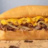 Melted American cheese topping shaved steak, accompanied by grilled onions