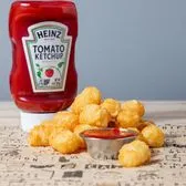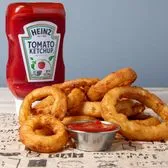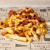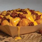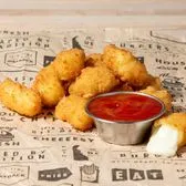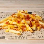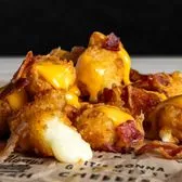 Crispy cheddar cheese curds topped with melty cheese sauce and chopped bacon.
