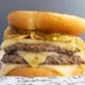 Two made-to-order beef patties, topped with Pepper Jack cheese, crispy fried onions, and pineapple jalapeño jam, sandwiched between an inverted, grilled, buttered bun.