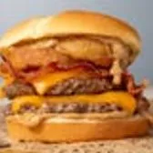 Two beef patties, bacon, cheddar cheese, onion ring, bourbon mustard