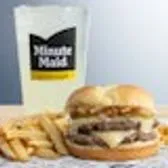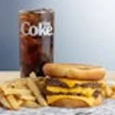 Cheeeesy Burger (four slices of melted American cheese, two beef patties, sandwiched between an inverted, grilled, buttered bun), served with a regular size French Fry, and a 22oz Coca-Cola® Beverage of your choice.