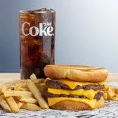 Cheeeesy Burger (four slices of melted American cheese, two beef patties, sandwiched between an inverted, grilled, buttered bun), served with a regular size French Fry, and a 22oz Coca-Cola® Beverage of your choice.