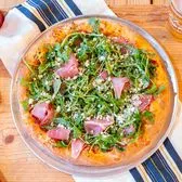 Red sauce base, prosciutto, goat cheese, wild arugula tossed in our home made honey balsamic wine vinaigrette.