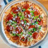 Red sauce base, pepperoni, sage sausage, red onions, green pepper, and fresh portobella mushrooms.