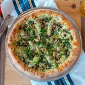 Garlic butter base, fresh baby spinach, roasted garlic, grilled chicken, feta and crushed red peppers.