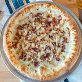 Red sauce base, bacon, ground beef, mozzarella, provolone and cheddar cheese.
