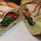 Ovengold or smoked cajun turkey, spinach, red onion, roma tomato, hot-sweet peppers, provolone; garlic mayo, oil, vinegar, oregano
