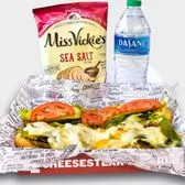 Charleys Veggie Cheesesteak Boxed Meal includes a veggie cheesesteak made with grilled mushrooms, onions, and green peppers topped with melted American, Provolone and cheddar cheese and served on our signature toasted roll. Lettuce, tomato, mayonnaise, and mustard packets are provided on the side. Consider adding Miss Vickie's Chips, Dasani bottled water, and a Chocolate Chunk Cookie to complete your meal.