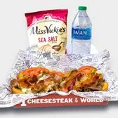 Charleys Old School Cheesesteak Boxed Meal includes an old school cheesesteak made with loaded extra grilled USDA-choice steak, Cheez Whiz®, and sautéed onions on a toasted roll. Consider adding Miss Vickie's Chips, Dasani bottled water, and a Chocolate Chunk Cookie to complete your meal.