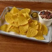 Queso blanco topped with freshly chopped brisket, served with crispy yellow corn tortilla chips and a side of jalapenos.