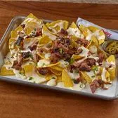Yellow corn tortilla chips topped with a 1/4 Lb. of chopped brisket, Chile con Queso Blanco, & green onions ~ served with pickled jalapenos and sour cream on the side