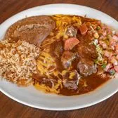 Two cheese enchiladas, topped with our carne guisada. Served with rice and choice of beans.