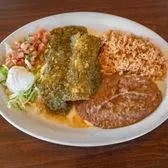 *Vegetarian* Two enchiladas topped with your choice of sauce. Served with rice and beans. Choose Black Beans if vegetarian.
