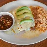 Tender chicken enchiladas topped with sour cream cheese sauce and fresh avocado slices. Served with black beans.